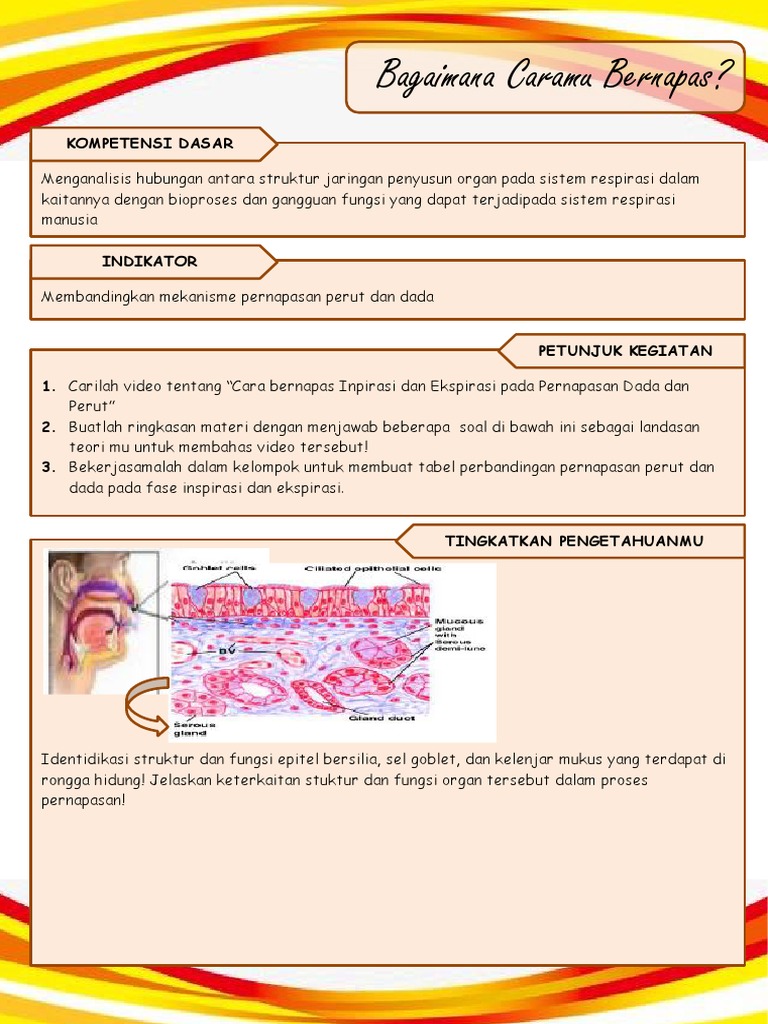 Lembar Kerja Siswa Lks Sistem Pernapasan from image.slidesharecdn.com Terdiri dari 2 versi, singkat dan lengkap! Pernafasan pada manusia dapat terjadi melalui pernafasan dada (menggunakan tulang rusuk) dan pernafasan perut (menggunakan otot diafragma). Bandingkan dengan gambar 6, video mri yang menunjukkan gerakan dada selama siklus pernapasan. Pernapasan sangat penting bagi kehidupan karena selain itu, pernapasan menghilangkan kelebihan air dari tubuh melalui pernafasan. Melaksanakan pranayama/pernafasan ini harus dengan kepandaian dan keahlian. Proses pernafasan manusia, biologi sma, kelas xi, yosi skanda mirza. Pada proses pernafasan perut tahap inspirasi yang akan terjadi yakni fungsi otot lurik polos dan jantung pada bagian diafragma akan mengalami kontrasi atau tegang. Mashindra prisma saputra 7 months ago.