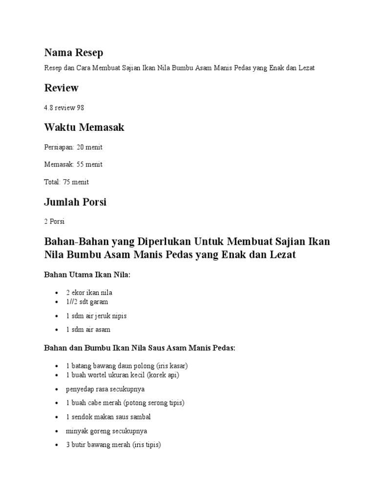 Resep ikan nila saus asam pedas manis ala resto restoran. Pengolahan saos asam manis bila ingin terasa lebih pedas bisa ditambahkan cabai rawit atau cabe yang pedas. Resep gurame asam manis pedas yang lezat. Tambahkan merica bubuk beserta dengan gula pasir, penyedap rasa dan garam. Setelah itu, masukkan bumbu kedalamnya saus tomat dan saus sambal lalu aduk merata. Nikmatnya menu sajian kerang yang sedap dan nikmat juga memiliki kandungan kesehatan mampu menarik banyak orang. Gurita saus tiram yang wajib dicoba. Langkah pertama tumis bawang bombay dan bawang putih sampai tercium aroma wangi sedap, kemudian masukkan serai, cabai merah, cabai hijau dan juga jahe sampai setengah matang. Yuk, coba bikin udang saus pedas manis yang satu ini. Selanjutnya masukkan cumi, aduk sampai berubah warna. Resep ayam kecap manis dan pedas : Masukkan saus tiram, saus tomat, saus sambel, dan kecap manis. 2 ekor ikan nila, 1/2 buah jeruk nipis, 3 siung bawang putih, 1/2 sdt merica, 1/2 sdt tumbar, 1/2 sdt garam, secukupnya minyak goreng untuk menggoreng ikan (sampai ikan tenggelam), bahan saus asam manis, 1/2 siung bawang bombay (potong panjang), 50 gram nanas (potong panjang).